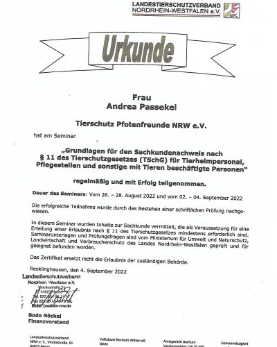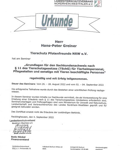 Unsere Teammitglieder Andrea Pasekel und Hans-Peter Greiner haben die Sachkunde § 11.